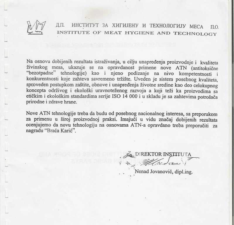 У месу коме је додаван АТН, садржај антибиотика, олова, кадмиума, живе, арсена, резидуа хербицида и пестицида је 0,00000. Резултат раван еколошком чуду!