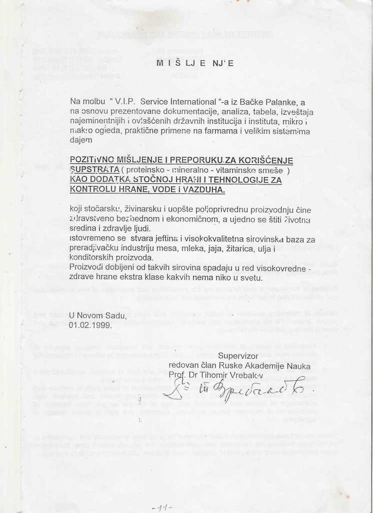 На основу представљене документације, анализа, табела и извештаја најеминентнијих и овлашћених државних институција и института, микро и макро огледа, као и вишегодишње практичне примене на фармама, Проф.Др. Вребалов дао је позитивно мишљење и препоруку за коришћење супстрата АТН, као додатка сточној храни, који сточарску, живинарску и уопште пољопривредну производњу чини здравствено безбедном и економичном, јер уједно штити животну средину и здравље људи. То је супериорна храна новог милениума испред старе органске, нове хемијски третиране и најновије генетски модификоване хране.