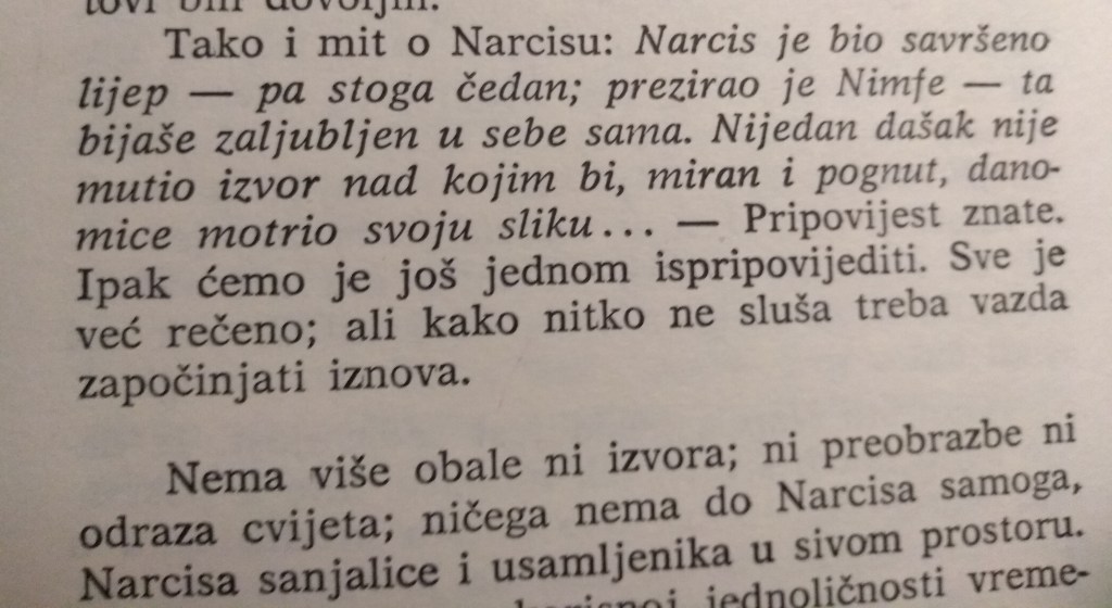 Баш као митолошки Нарцис, наиме Нарикс, тј. наркос навучен на самог себе. Ехо му дође као колатерална штета. Повлачи се у самоћу после одбитка, заробљена у еху своје вечне туге. Њено нестабилно сопство само је звучно огледало. Оно што психолози називају „козависница“, али то је један несрећан термин који не описује суштину проблема. Зато је Др. Рос Розенберг потпуно у праву када га прекрштава у „поремећај недостатка самољубави“ (извините, потпуно смо уништили језик, сигурно је постојало бар десет речи да опише све нивое ове патологије). Касно ћете схватити да то више није никакава бајка, никаква алегорија, већ почетак крваве саге краја доба невиности. „Смирела“ никада доћи неће, а ви ћете исплакати Панталасу суза. Бубашвабица-предаторка громогласно ће подригнути, задовољно се насмејати крајичком усне, опет подригнути, те кренути у потрагу за новим пленом. Не, неће се осврнути, не ложте се без везе. Пустиће вас да цркнете у најгорим мукама. Штавише, цуреће јој бале од задовољства. А, ви сте очекивали саосећање (смех). У ствари хоће, али само ако је преостало још мало меса да се оглође с костију (месо могу бити и деца коју ће вам изродити, али и контрола, надзор) и то само у случају ако је остала без издашног плена. Мајмунској публици рећи ће да уопште не зна ко сте, да вас не познаје, или да сте лудак/иња који је прогања, да сте ви њу унесрећили, малу јадну невину бубашвабицу. А, ви сте у ствари само седели код куће и плакали, у кафани чаше ломили, или по ноћним клубовима црте сатирали. Онда, Јово-наново: љубавна бомбоница, па стена тврде столице у главу, па опет „лајсна“ лажне љубави, па тољага испод плексуса. Мрва, па стена, па пола мрве, па планина фекалија. А, ви мислили то је љубав, мало турбулентнија, додуше. Ал’ нека, ваља се, да разбије монотонију и донесе меланхолију, јер ви сте посебни, јединствени у универзуму, зар не? Ваш спој космички је, вас и ваше нервозне бубашвабице. Боже мој, па сви су понекад мало нервозни. Али ви сте спремни све да учините не бисте ли бубашвабицу претворили у принцезицу.